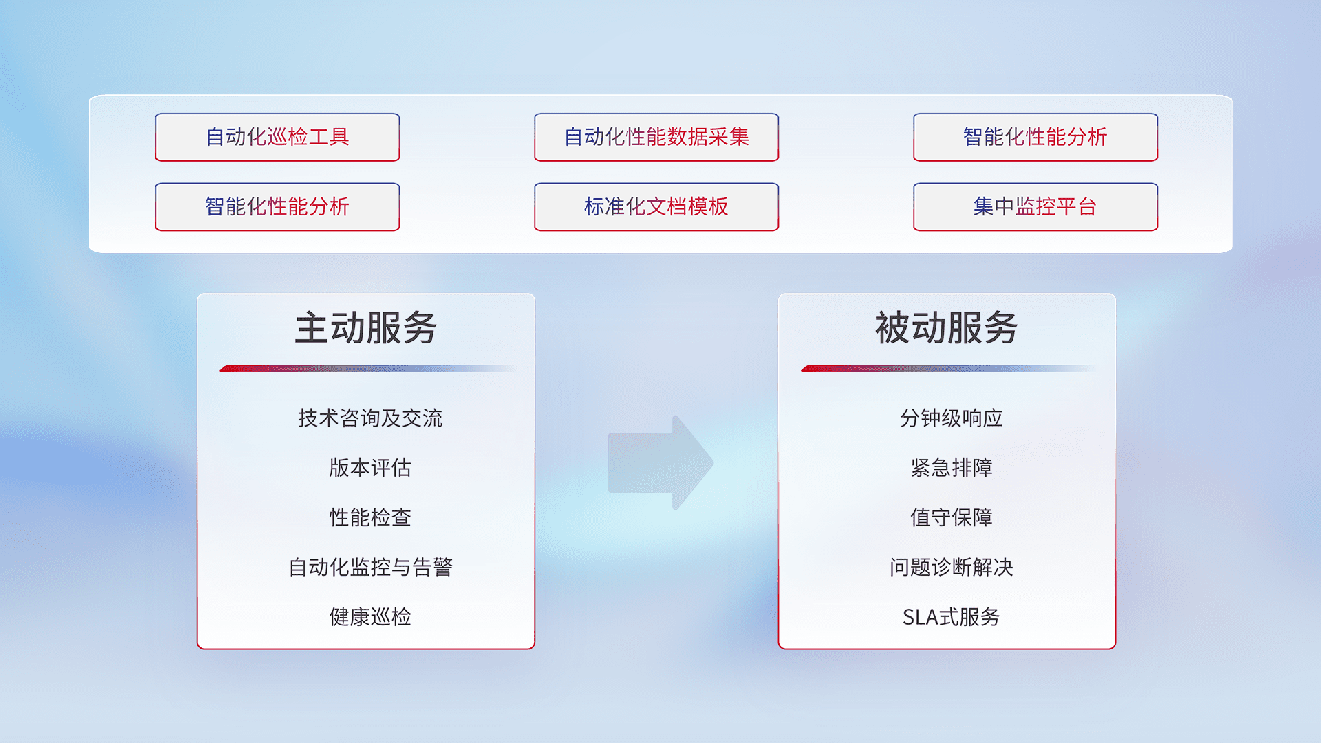 智能化工具和标准化文档,,,保障服务质量,,,提供主动服务(包含技术咨询、、、版本评估、、、性能检查、、自动化监控与告警、、健康巡检)和被动服务包含(分钟级响应、、、、紧急排障、、、值守保障、、、、问题诊断解决、、、、SLA服务)。。