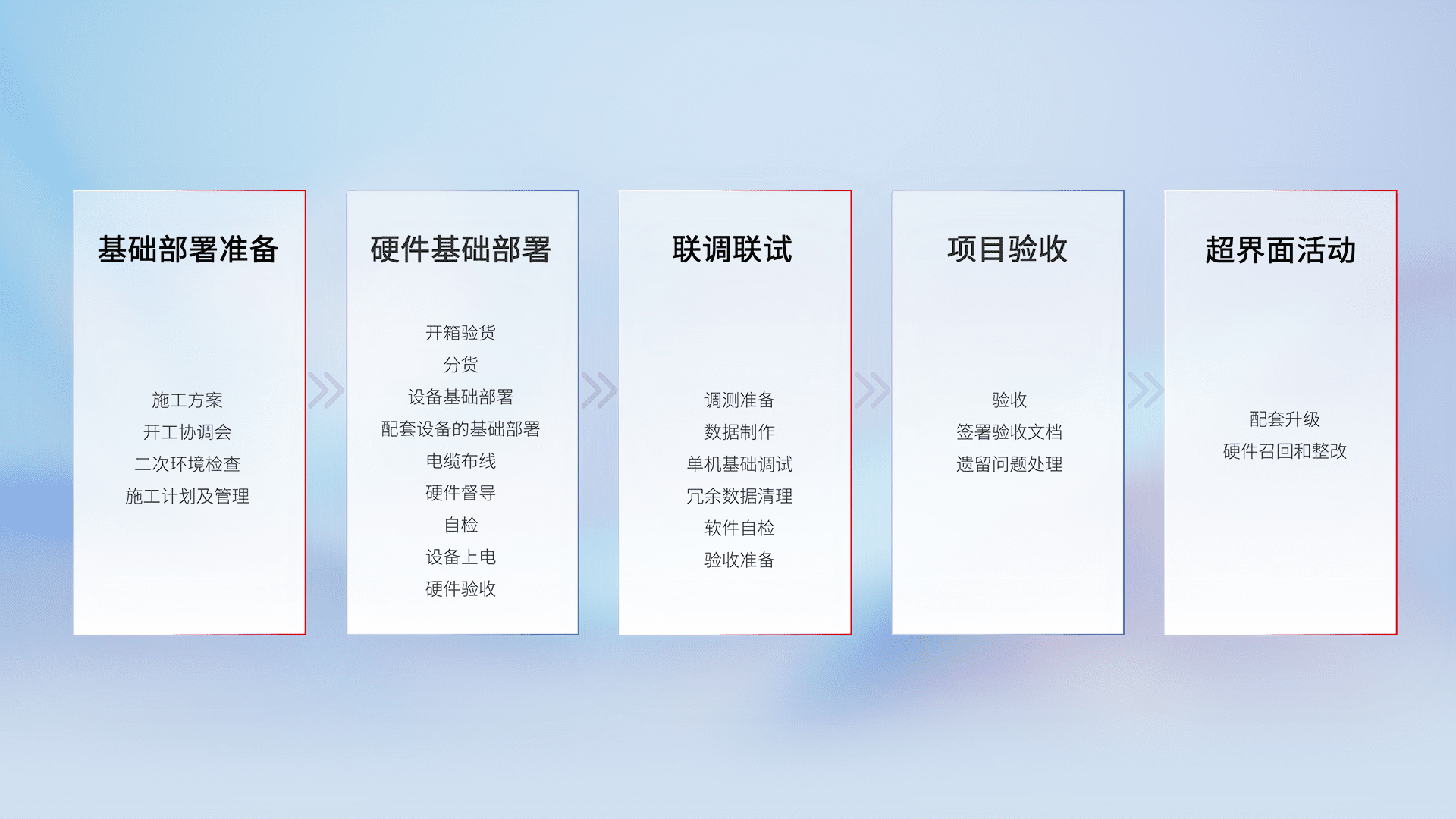 从基础部署准备、、硬件基础部署、、、联调联试、、、项目验收、、、越界面活动的全过程可追溯,,保证施工质量和进度。。。。